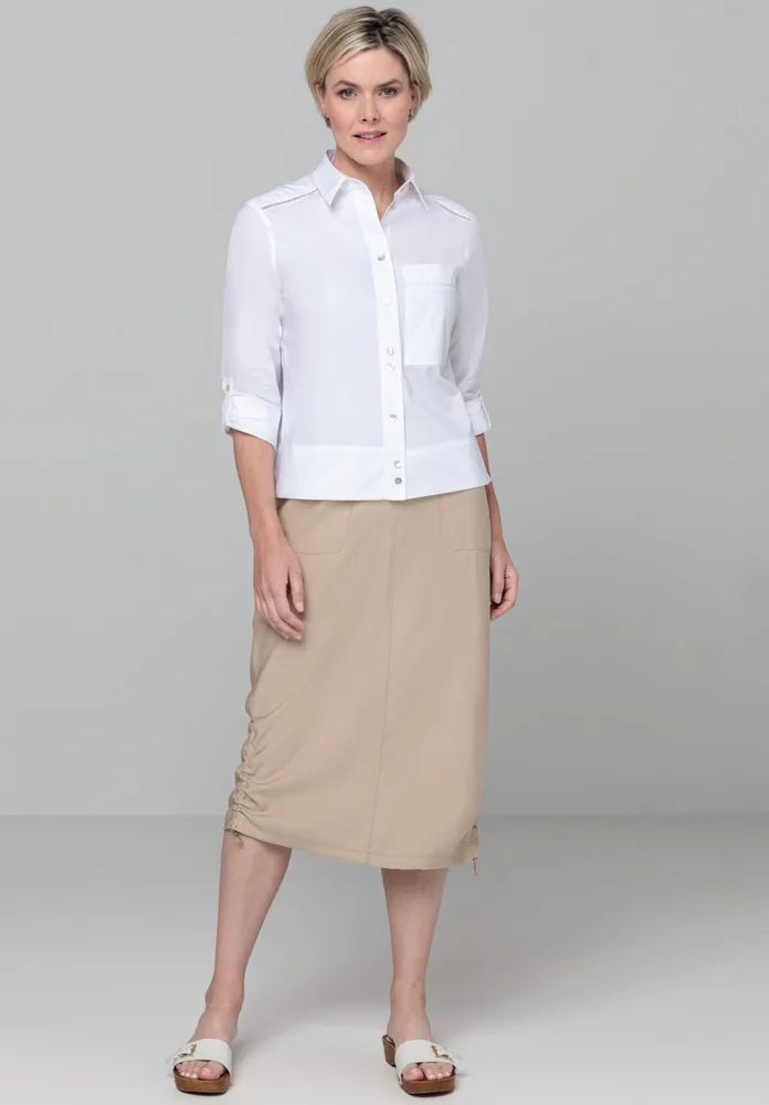 Naše trendová letní sukně je nejlepším společníkem do teplých dnů! Dá se skvěle kombinovat s různými barvami a topy a díky směsi viskózy se příjemně nosí. Speciální vzhled dotváří přední vstup s knoflíkem a zipem, pohodlný elastický pas a rozparek vzadu, našité kapsy vpředu a možnost nařasení sukně. Sukně se stane hezkým nálezem pro nekomplikovaný každodenní vzhled!