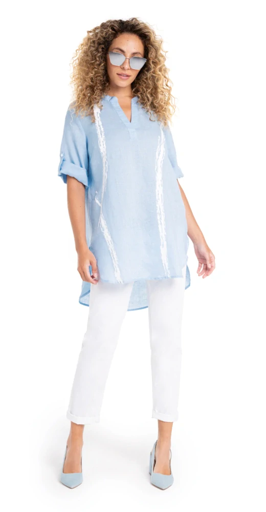 Tato krásná světle modrá tunika z lehkého lněného materiálu je ideální pro jarní a letní dny. Originální bílý vzor dodává moderní a svěží vzhled. Volný střih a pohodlný materiál zajišťují maximální komfort při nošení. Skvělá volba pro každodenní outfity i volnočasové aktivity!