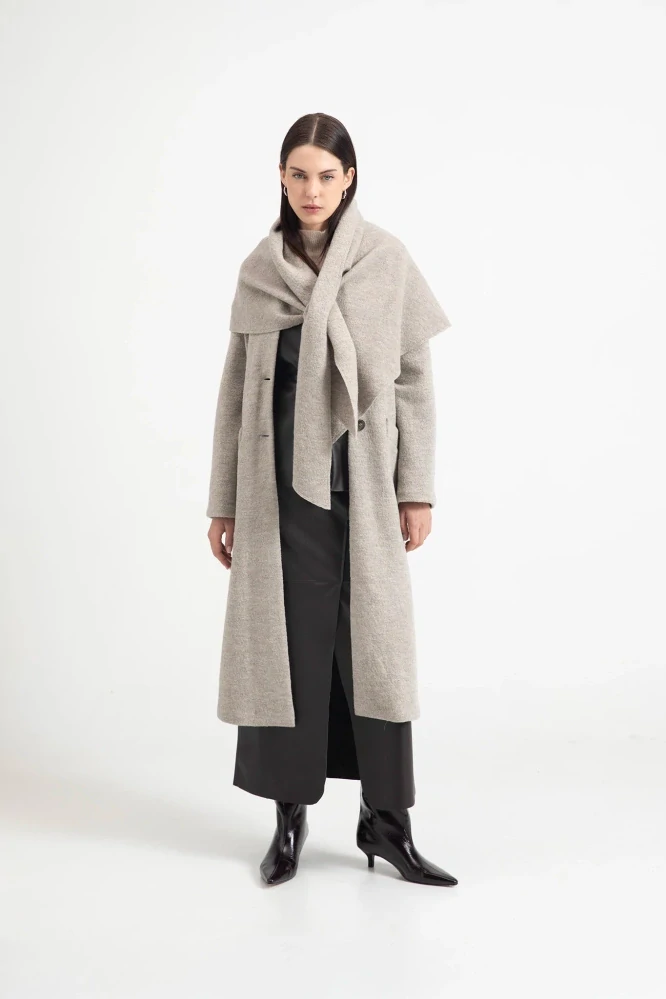 Dlouhý kabát z béžové vařené vlny. S předním zapínáním na tři knoflíky, páskem z téže látky a nakládanými kapsami.