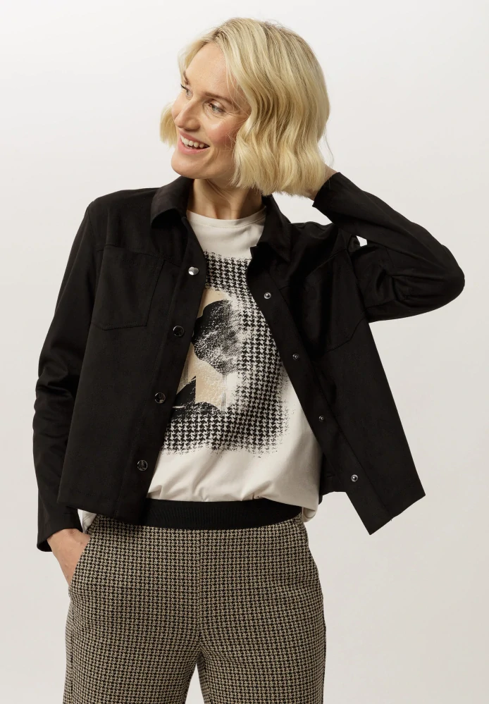 Moderní dámská krátká bunda v nadčasové černé barvě s čistými liniemi a praktickým zapínáním na kovové druky. Díky pružnému, hladkému materiálu se krásně přizpůsobí postavě a poskytuje maximální pohodlí při nošení.