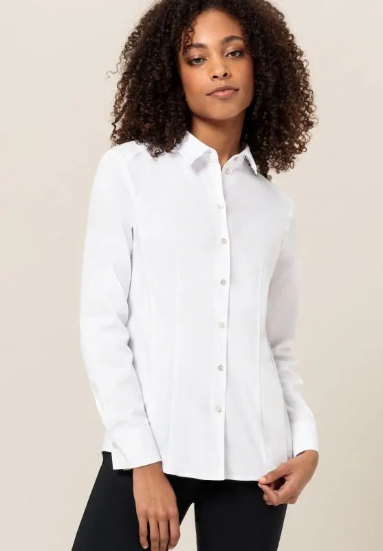 Trendy košilová halenka  je nadčasová a moderní. Díky směsi elastické bavlny se halenka s dlouhým rukávem skvěle nosí. Košilový límeček, knoflíková léga s knoflíky a důmyslně umístěné dělící švy dodávají halence ženský nádech. Díky tomu je košile perfektním společníkem pro mnoho příležitostí. Stylujte je jednoduše se svými business kalhotami do kanceláře nebo s džínami a teniskami pro každodenní život.