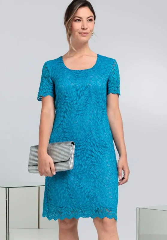 Naše šaty jsou snem v krajce! Díky čtvercovému výstřihu a průhledným krátkým rukávům jsou krajkové šaty perfektním outfitem pro zvláštní příležitosti. Měkká a elastická krajka v trendové barvě "aqarius" je vzadu se zipem a elastickou vnitřní podšívkou, proto je nošení velmi pohodlné a bezpečné. Díky mírně přizpůsobenému střihu a speciálnímu vroubkovanému okraji na rukávech a lemu sukně jsou šaty skvělým poutačem.