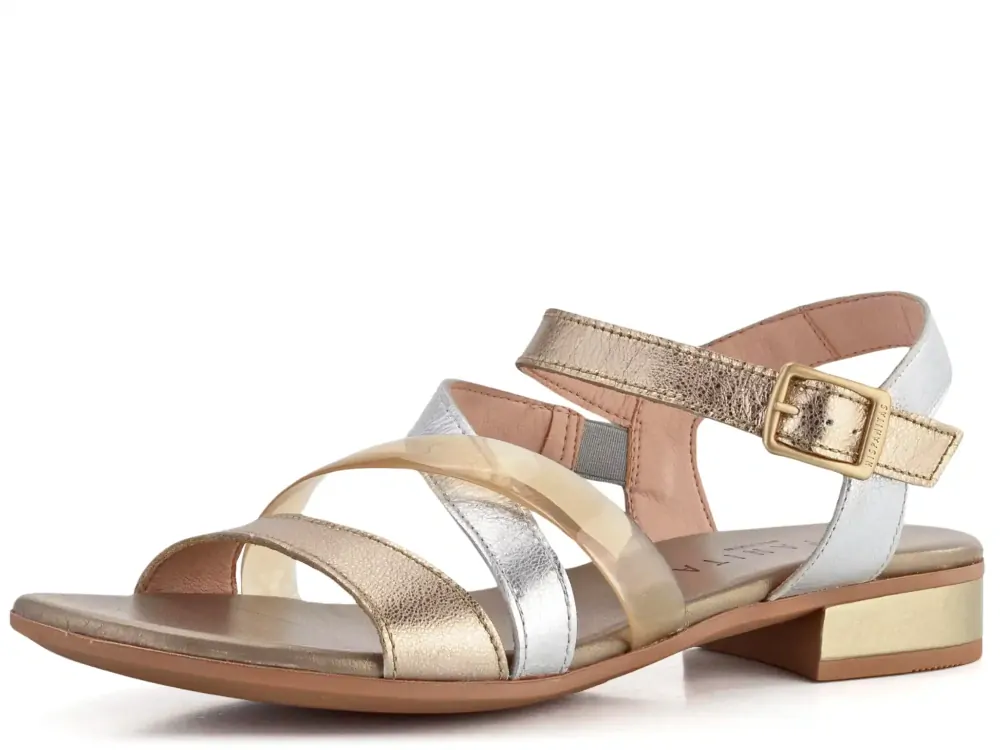 - obuv vyrobena z jemně strukturované, metalické kůže (jeden z pásků je z průhledné syntetiky)