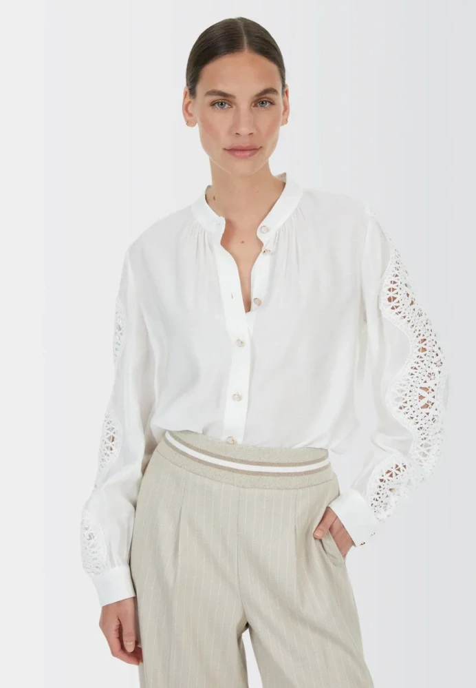 Nadčasová bílá halenka vyniká jemně romantickým vzhledem díky nádherným krajkovým aplikacím, které zdobí celé délky rukávů.
