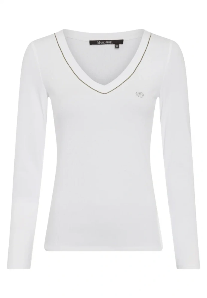 Elegantní a nadčasové tričko s dlouhým rukávem od značky Marc Aurel. Hladký, jemně žebrovaný materiál krásně kopíruje postavu a poskytuje maximální komfort při nošení. Výstřih do V je zvýrazněn decentním lemováním ve zlatém odstínu, který dodává tričku sofistikovaný nádech. Malé logo s kamínky podtrhuje prémiový vzhled.