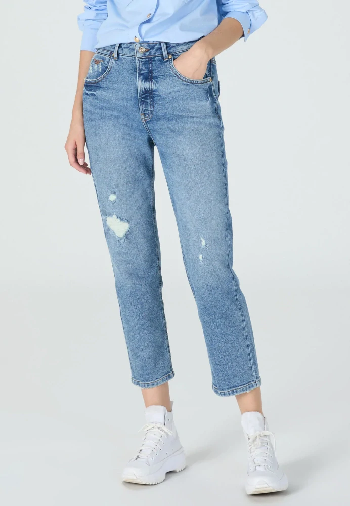 Tyto boyfriend džíny s výšivkou loga a destruhů dodají každému outfitu ostrý nádech. Bavlněná směs se strečem zajišťuje pohodlí, zatímco zapínání na zip a detaily s 5 kapsami dotvářejí klasický denimový vzhled. Nezbytná výbava pro trendový vzhled.