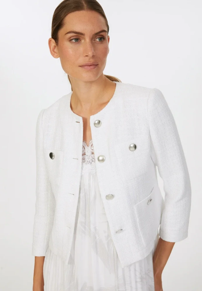 Tato krátká bunda vyrobená z bavlněné směsi s třpytivou lurexovou přízí je stylovým společníkem pro elegantní vzhled. Úzký střih a našité kapsy vytvářejí moderní siluetu, lesklé ozdobné knoflíky dodávají designu zvláštní nádech. Ideální pro moderní vzhled.