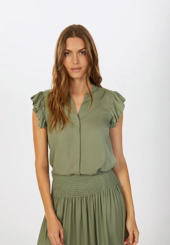 Tato halenka bez rukávů vyrobená z neformálního saténu s měkkým omakem dodává vašemu vzhledu moderní a elegantní nádech. Přiléhavý, uvolněný střih a volánky na průramcích vytvářejí stylový vzhled, zatímco ramenní třmeny a zakřivený lem dotvářejí design. Ideální pro letní dny.