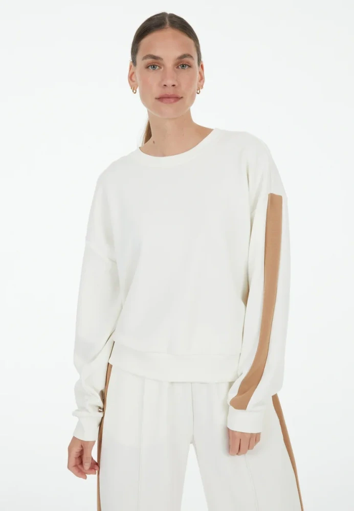 Pohodlná a stylová mikina v krémové barvě je ideálním kouskem pro volnočasové i ležérně elegantní outfity. Má volnější střih, kulatý výstřih a dlouhé rukávy. Na rukávech je umístěn hnědý kontrastní pruh, který dodává mikině moderní sportovně-šik vzhled.