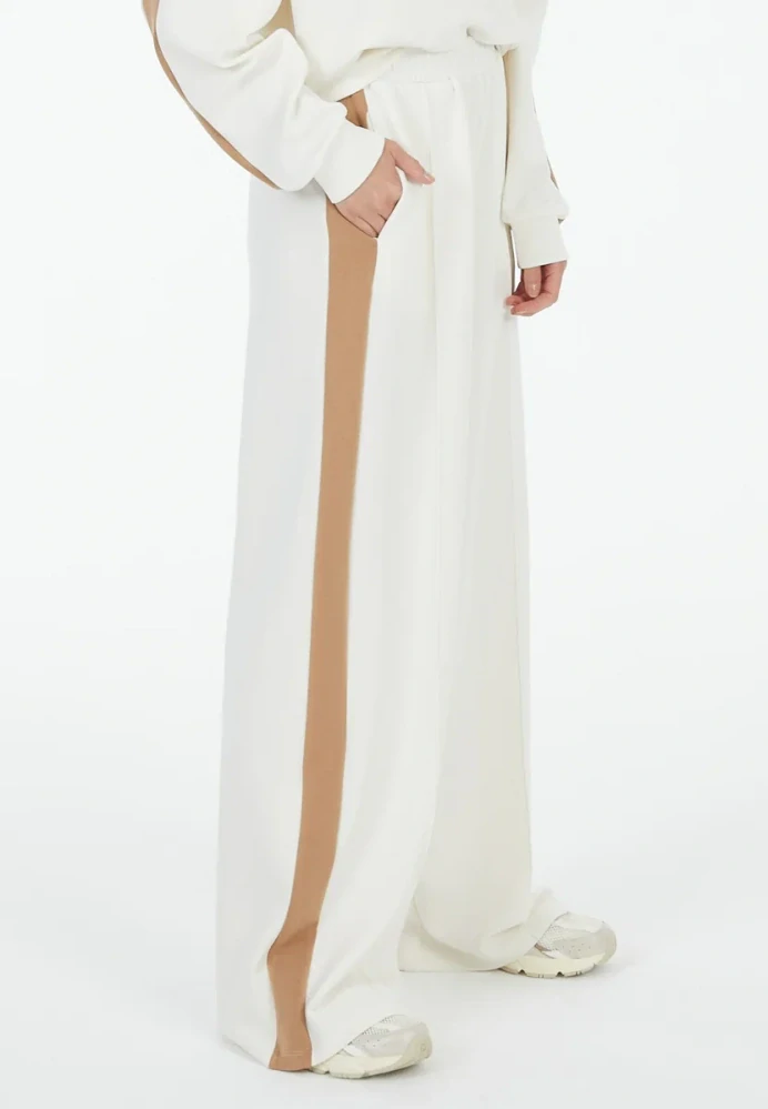 Moderní dámské kalhoty v elegantní krémové barvě s hnědými kontrastními pruhy po stranách dodávají outfitu sportovně-šik nádech.  Elastický pas zajišťuje maximální pohodlí při nošení a perfektně se přizpůsobí postavě.