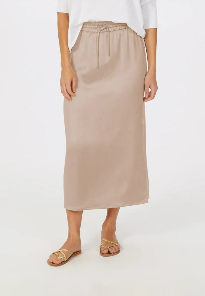 Tato maxi sukně vyrobená z neformálního saténu vytváří elegantní, ale uvolněný vzhled. Měkký splývavý satén s lehkým praním nabízí moderní vzhled, zatímco dvojité manžety a boční rozpark dodávají designu sportovní nádech. Ideální pro letní dny, kdy je vyžadován styl a pohodlí.