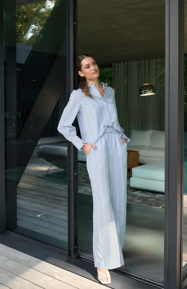 Objevte stylové pruhované kalhoty vyrobené z pohodlné směsi viskózy, která nabízí vysokou úroveň pohodlí. S běžným pasem a praktickými křídlovými kapsami kombinuje ležérní styl s funkčností. Ideální pro každou příležitost.