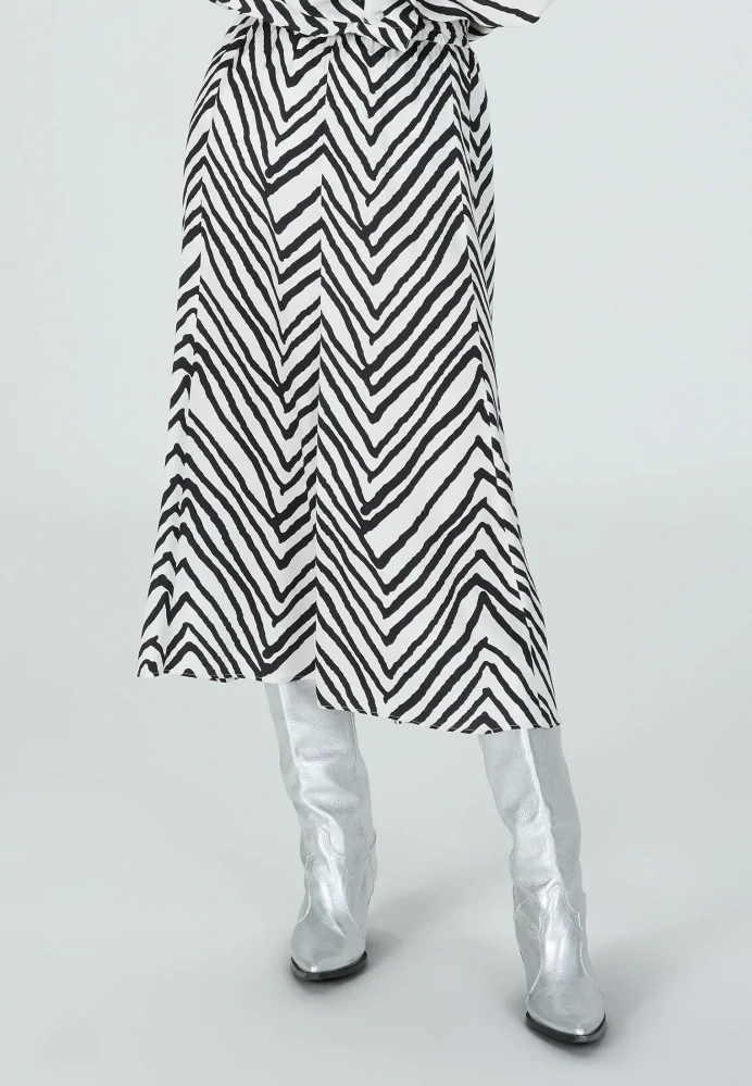 Tato midi sukně zaujme svým černobílým potiskem a splývavou viskózovou saténovou kvalitou. Široký střih a elastický pas nabízí maximální pohodlí, zatímco podélné švy a kapsy ve švech dodávají sukni ležérní eleganci.