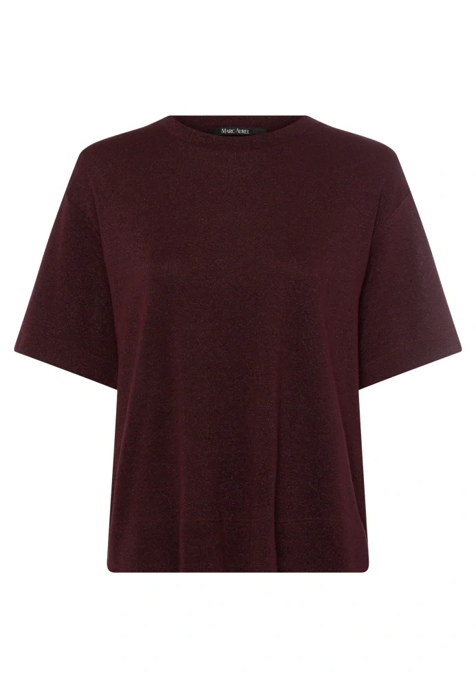 Stylové dámské tričko v bohatém bordó odstínu je vyrobené z měkké viskózy s metalickými vlákny, která mu dodávají jemný třpyt a luxusní vzhled. Má volnější komfortní střih, krátké rukávy a klasický kulatý výstřih. Díky své jednoduchosti a zároveň elegantnímu lesku je ideální jak na běžné nošení, tak na večerní příležitosti.