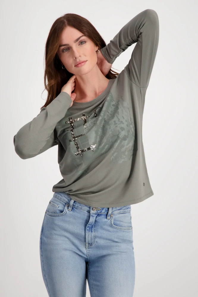 Stylová dámská mikina v jemném khaki odstínu s originálním potiskem a efektním zdobením z kamínků zaujme na první pohled. Decentní motiv dodává modelu moderní a elegantní vzhled. Pohodlný rovný střih s kulatým výstřihem a dlouhými rukávy se skvěle nosí a snadno kombinuje s džínami i elegantnějšími kalhotami.