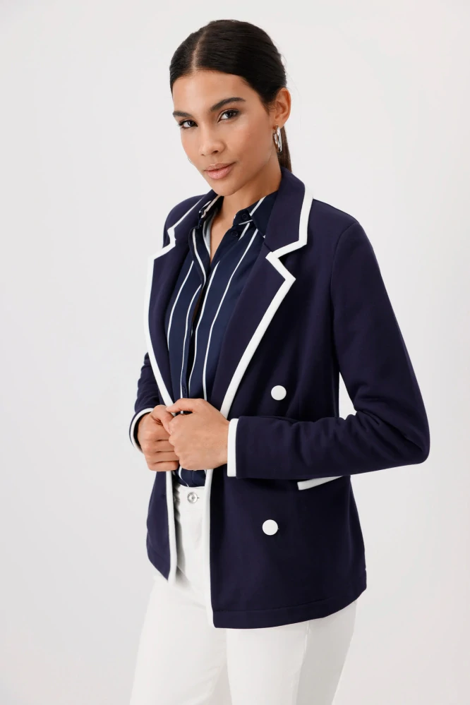 Elegantní dámské sako v tmavě modrém odstínu s výrazným bílým lemem působí velmi sofistikovaně a nadčasově. Dvojřadé zapínání s ozdobnými knoflíky podtrhuje jeho luxusní vzhled a dodává outfitu šmrnc. Klasický klopový límec a projmutý střih krásně zvýrazňují ženskou siluetu.
