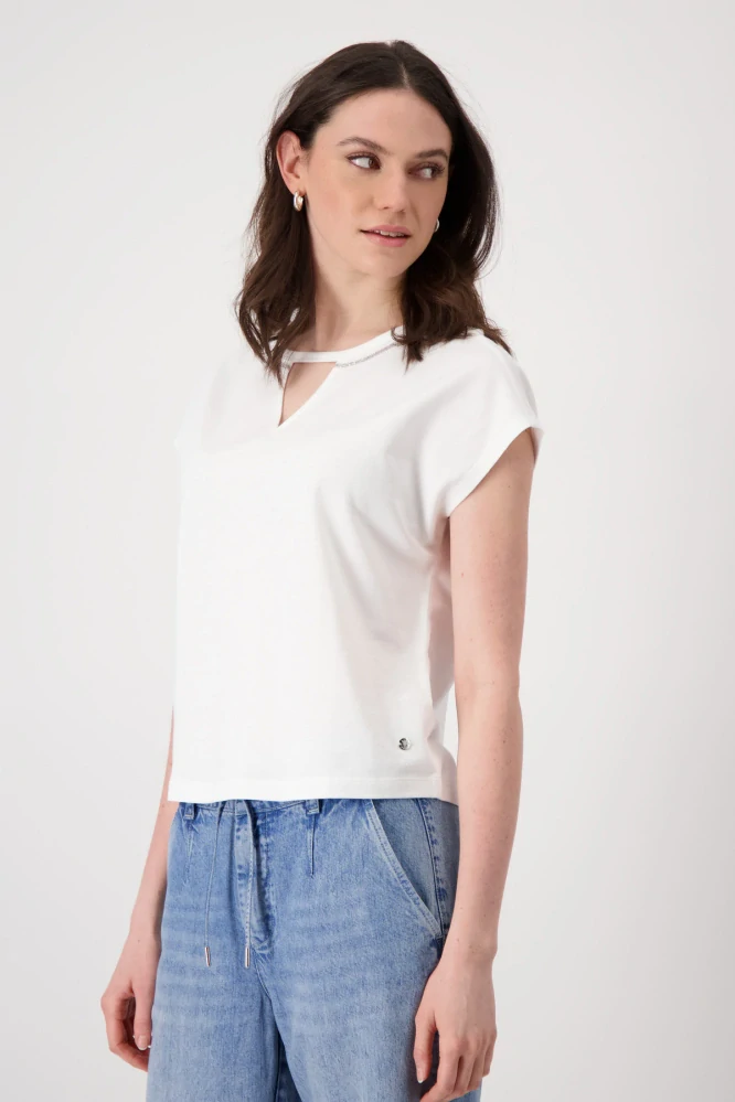 Stylové tričko v bílé barvě zaujme jemným výstřihem s decentním průstřihem, který dodává outfitu ženskost a eleganci. Volnější střih a krátké rukávy zajišťují pohodlí při nošení po celý den.