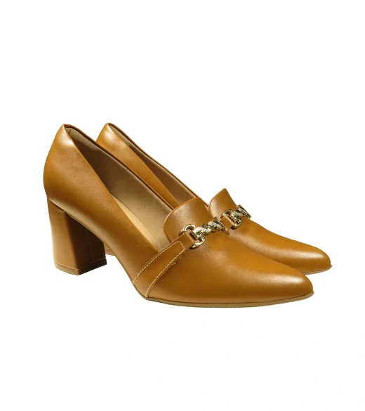 Moderní dámské lodičky ze syntetického materiálu v hnědé barvě s ozdobnou kovovou sponou. Elegantní špičatý střih a stabilní podpatek dodávají botám stylový vzhled a pohodlí. Skvělá volba pro každodenní nošení i formálnější příležitosti.