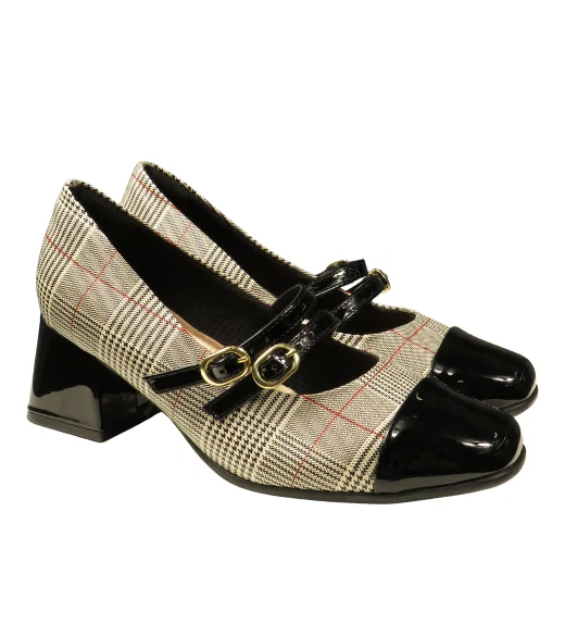 Tyto stylové dámské lodičky s nízkým podpatkem zaujmou originálním károvaným vzorem v kombinaci s lesklou lakovanou špičkou. Dvojitý pásek se zlatými přezkami dodává botám šmrnc a zároveň poskytuje pohodlné upevnění. Skvělá volba pro ženy, které hledají eleganci s nádechem originality.