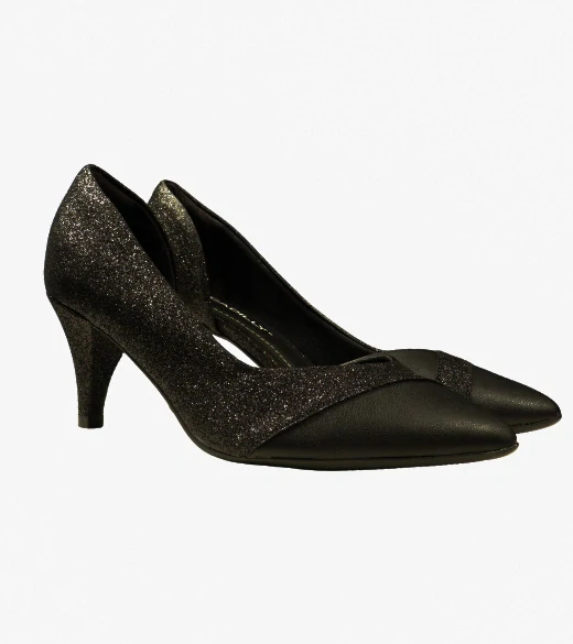 Stylové dámské lodičky se středním podpatkem v černé barvě s třpytivým povrchem. Kombinace matného a lesklého syntetického materiálu působí moderně a sofistikovaně. Perfektní obuv pro večerní akce, plesy či elegantní pracovní outfit.