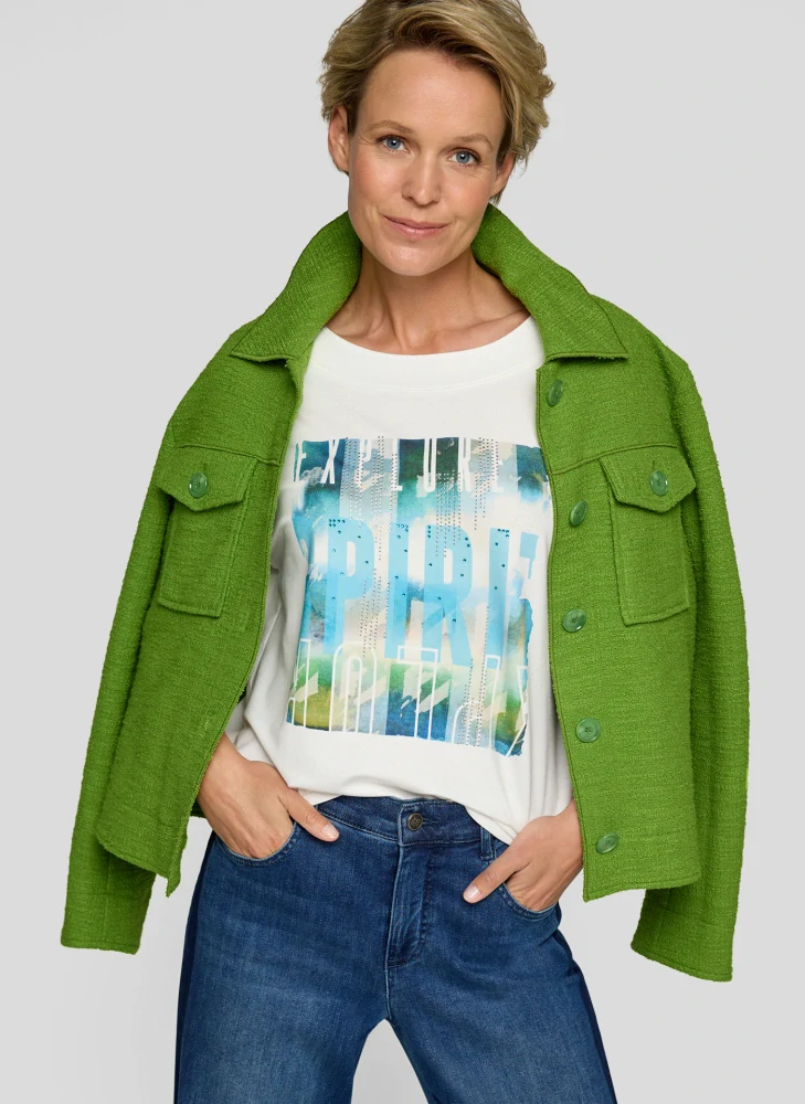 Dámská halenka v bílé barvě je zdobená moderním vícebarevným potiskem v odstínech modré a zelené. Má volnější střih, kulatý výstřih a dlouhé rukávy, takže poskytuje pohodlí při celodenním nošení. Halenka se díky splývavé viskóze krásně přizpůsobí postavě a působí elegantně i ležérně zároveň.