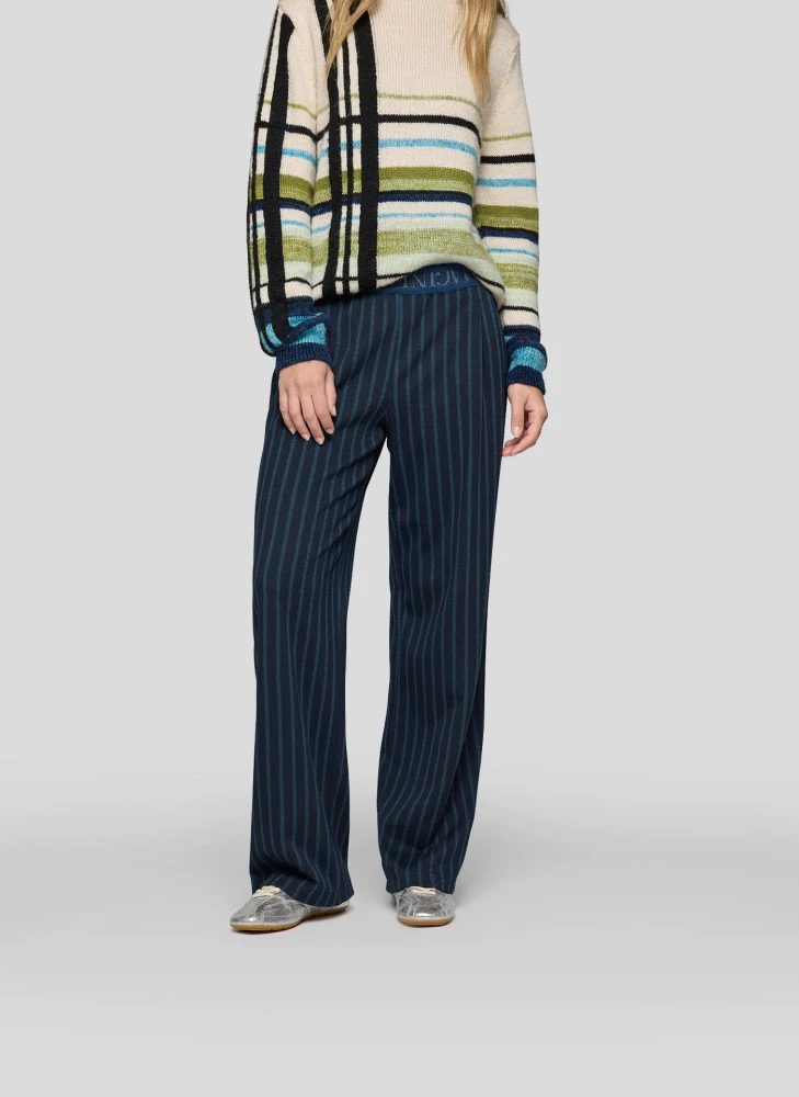 Dámské kalhoty v tmavě modré barvě s úzkým zeleno-modrým proužkem jsou perfektní volbou pro stylový, ale zároveň pohodlný outfit.. Pohodlný elastický pas s jemným nápisem dodává kalhotám moderní nádech a zajišťuje příjemné nošení po celý den.