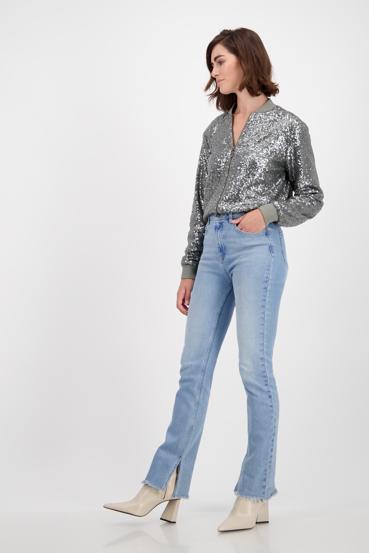 Elastické rovné džíny mají cool wash v použitém vzhledu a vnitřní rozparek nohavic s třásněmi.