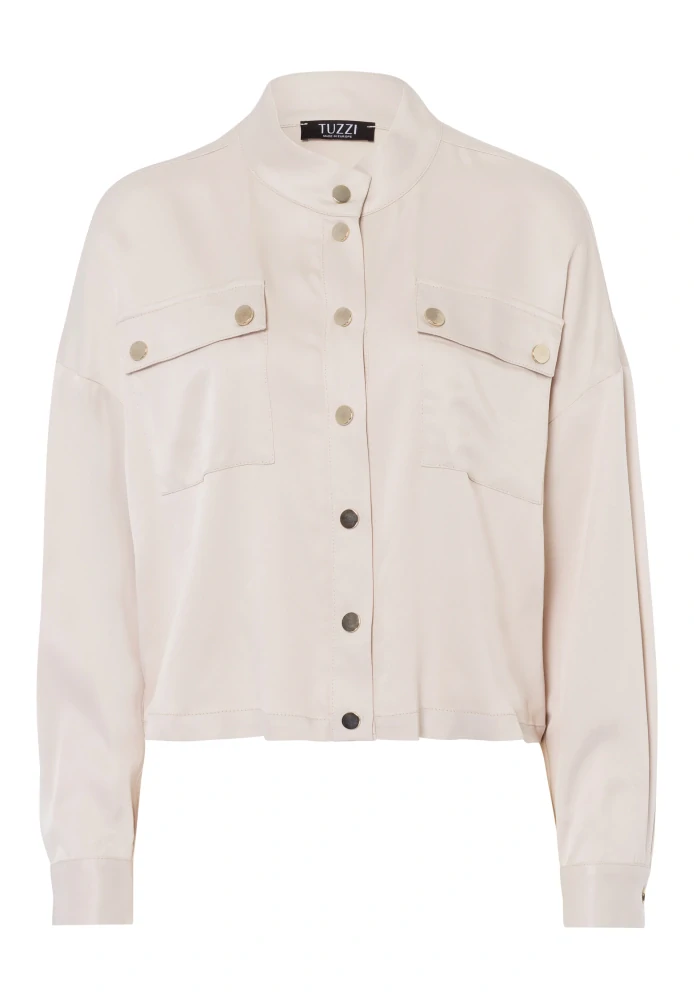 Elegantní krátký kabátek od značky TUZZI v neutrální béžové barvě. Tento moderní model se vyznačuje stojáčkem, kovovými knoflíky a dvěma náprsními kapsami s klopami, které mu dodávají sofistikovaný vzhled.