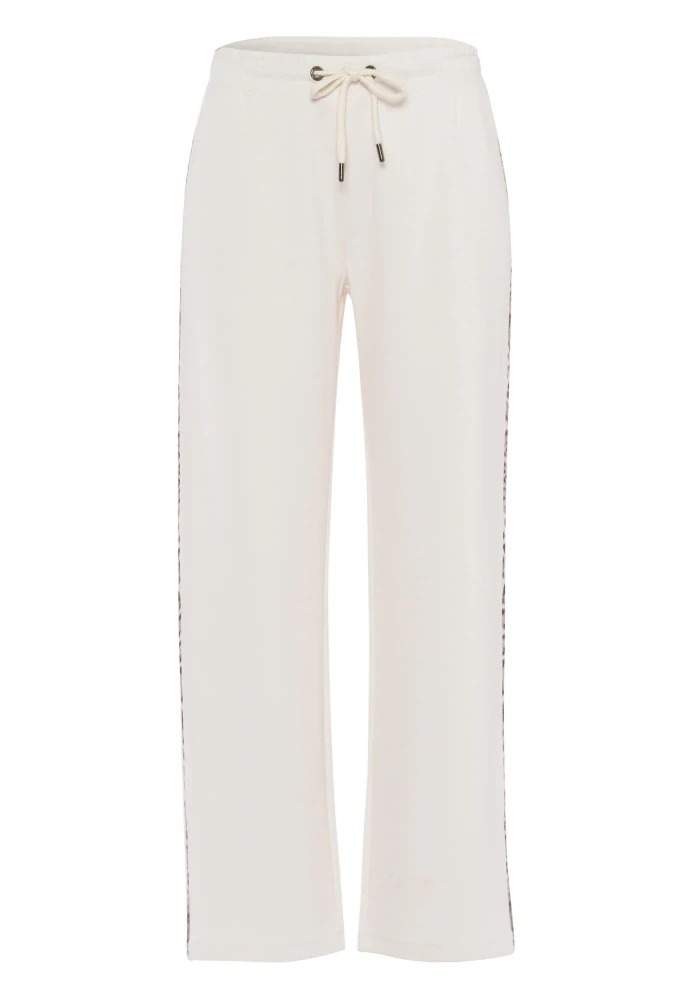 Elegantní a pohodlné tepláky v krémové barvě s decentním leopardím pruhem po stranách. Ideální volba pro ženy, které chtějí spojit komfort s moderním stylem. Kalhoty mají elastický pas se stahovací šňůrkou, rovný střih a hladký, příjemný materiál, který se krásně přizpůsobí postavě.