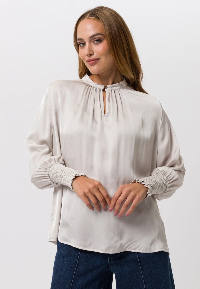 Splývavá halenka s nariasenými manžetami, malým stojáčkem a jemným leskem – ideální pro ženský každodenní outfit.