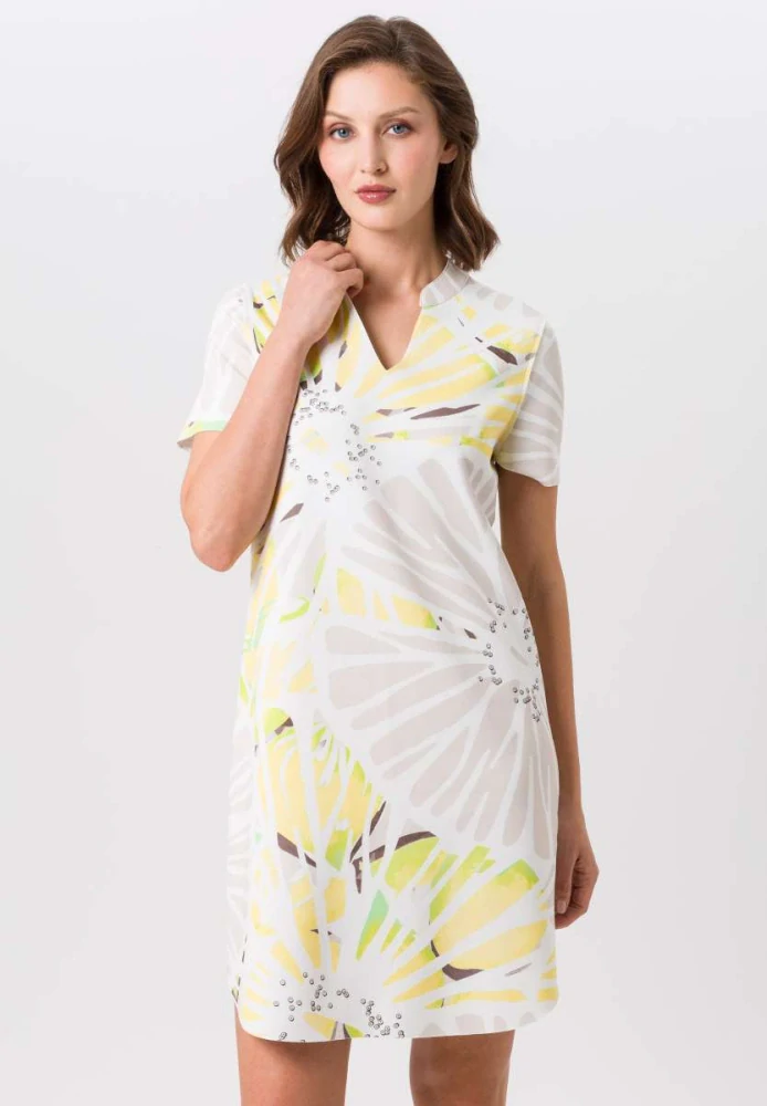 Elegantní oboustranné šaty od značky TUZZI s výrazným letním potiskem v odstínech žluté, bílé a béžové. Můžete je nosit ze dvou stran – s výstřihem do „V“. Styl a variabilita v jednom kousku! Ideální volba pro dovolenou i městské procház