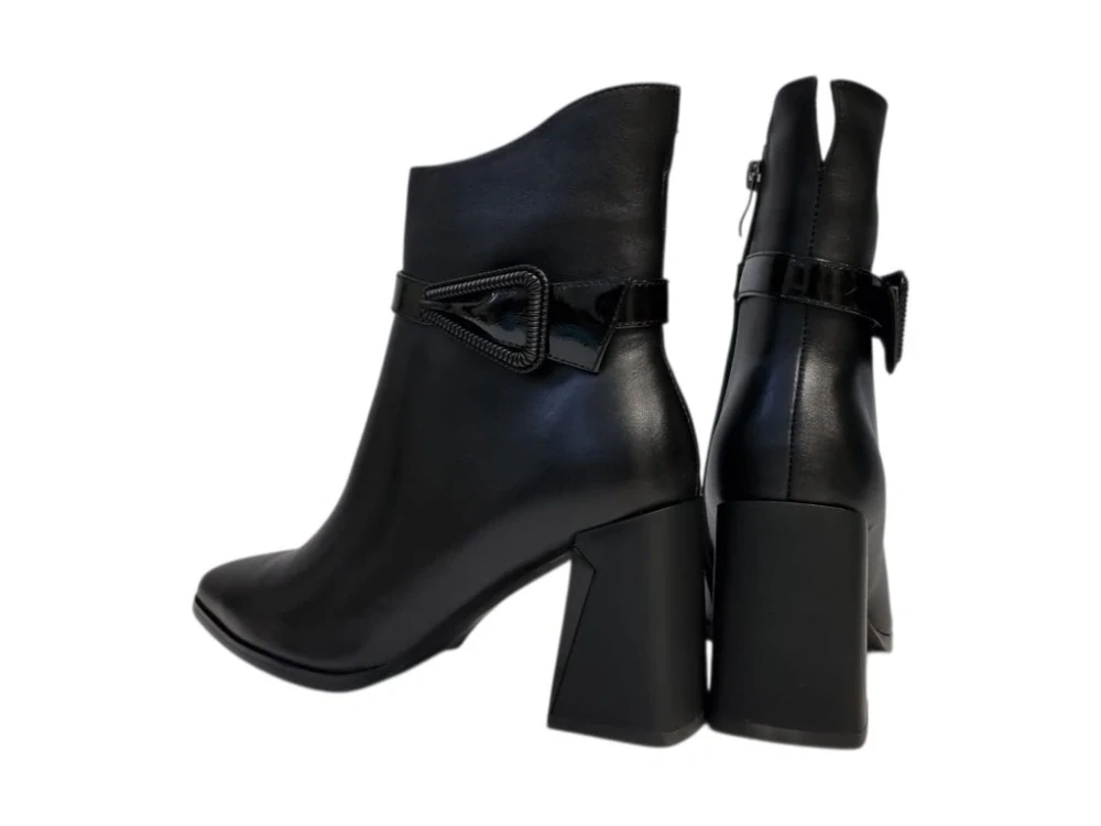Elegantní černé kotníkové boty s výrazným podpatkem a ozdobným páskem dodají vašemu outfitu sofistikovaný a ženský vzhled.