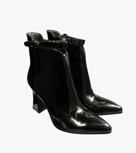 Dámské lakované kotníkové boty v elegantní černé barvě působí moderně a sebevědomě. Lesklý povrch, úzká špička a originálně tvarovaný podpatek vytvářejí výrazný, ale stále nadčasový vzhled.